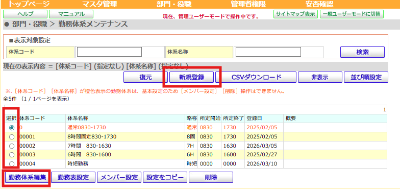 【トップページ画面】【管理ユーザーモード】メニュー一覧から[部門・役職]>[勤務体系メンテナンス]を選択すると、【勤務体系一覧画面】が表示されます。 「勤務体系メンテナンス」では、次の操作を行うことができます。