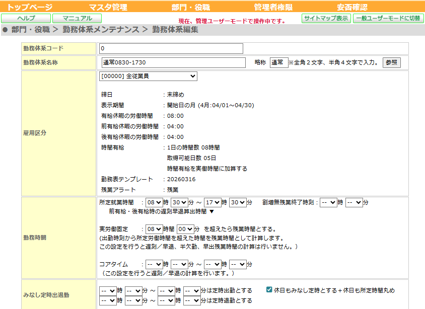 - 勤務体系の変更を行った場合、過去に遡って全ての勤務実績が新しい勤務体系情報を反映して再計算されるわけではありません。