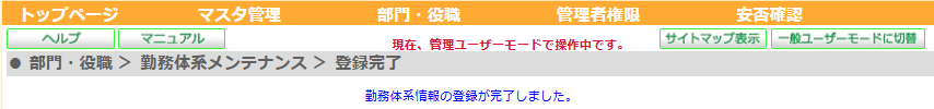 勤務体系の登録が完了すると、登録が完了したことを通知するメッセージが【登録完了画面】に表示されます。
