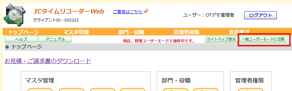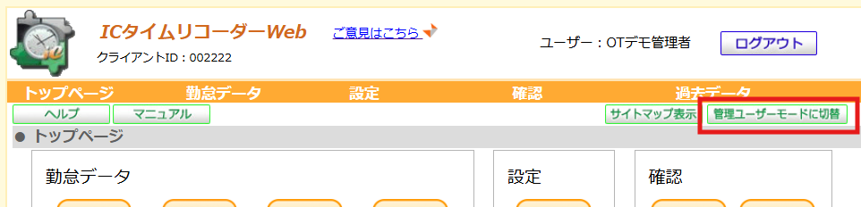 画面右上の「管理ユーザーモードに切替」ボタンで、モードが切り替わります。